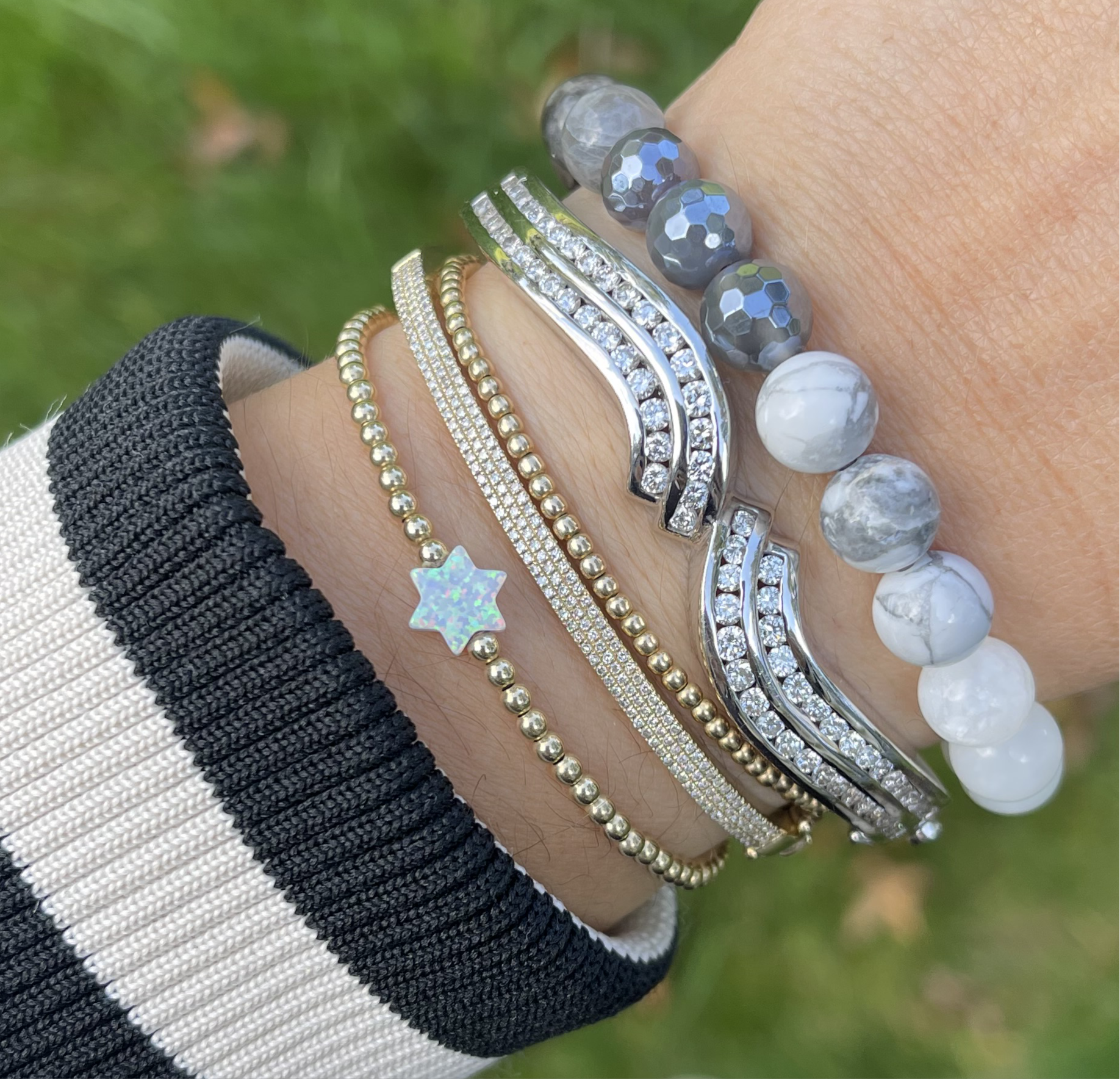 This stunning Magen David bracelet features a beautiful white Opal sourced from Israel. A unique and meaningful piece of jewelry that adds a touch of sparkle.